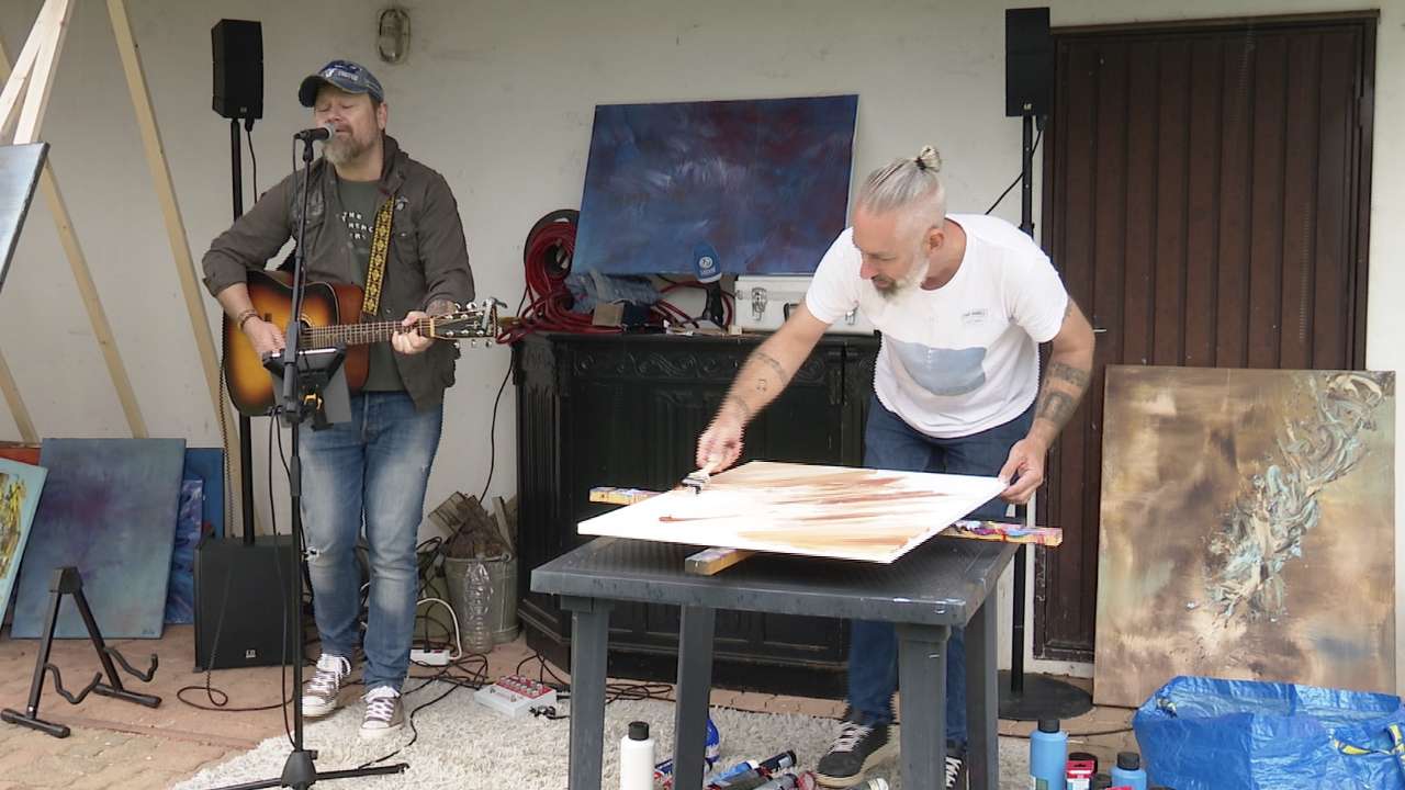 Le temps d'écouter trois chansons en live du guitariste fribourgeois Chris Maldah, l'artiste Angelo Oliva réalise une toile qui sera vendu aux enchères au profit de la pédiatrie de l'Hôpital du Jura. C'était l'un des temps fort d'une exposition donné ce week-end dans son jardin de Courfaivre pour fêter 10 ans de peinture.