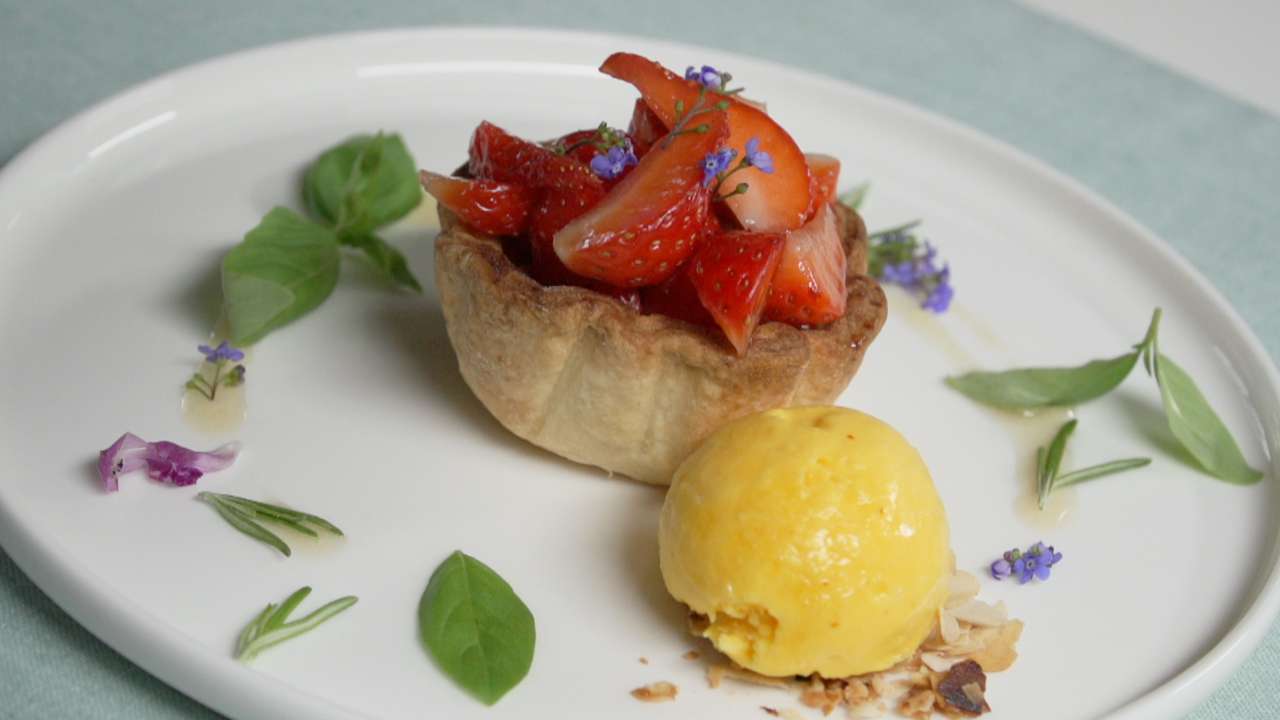 Tartelette aux fraises avec son coeur de rhubarbe chez Aline Jeandrevin