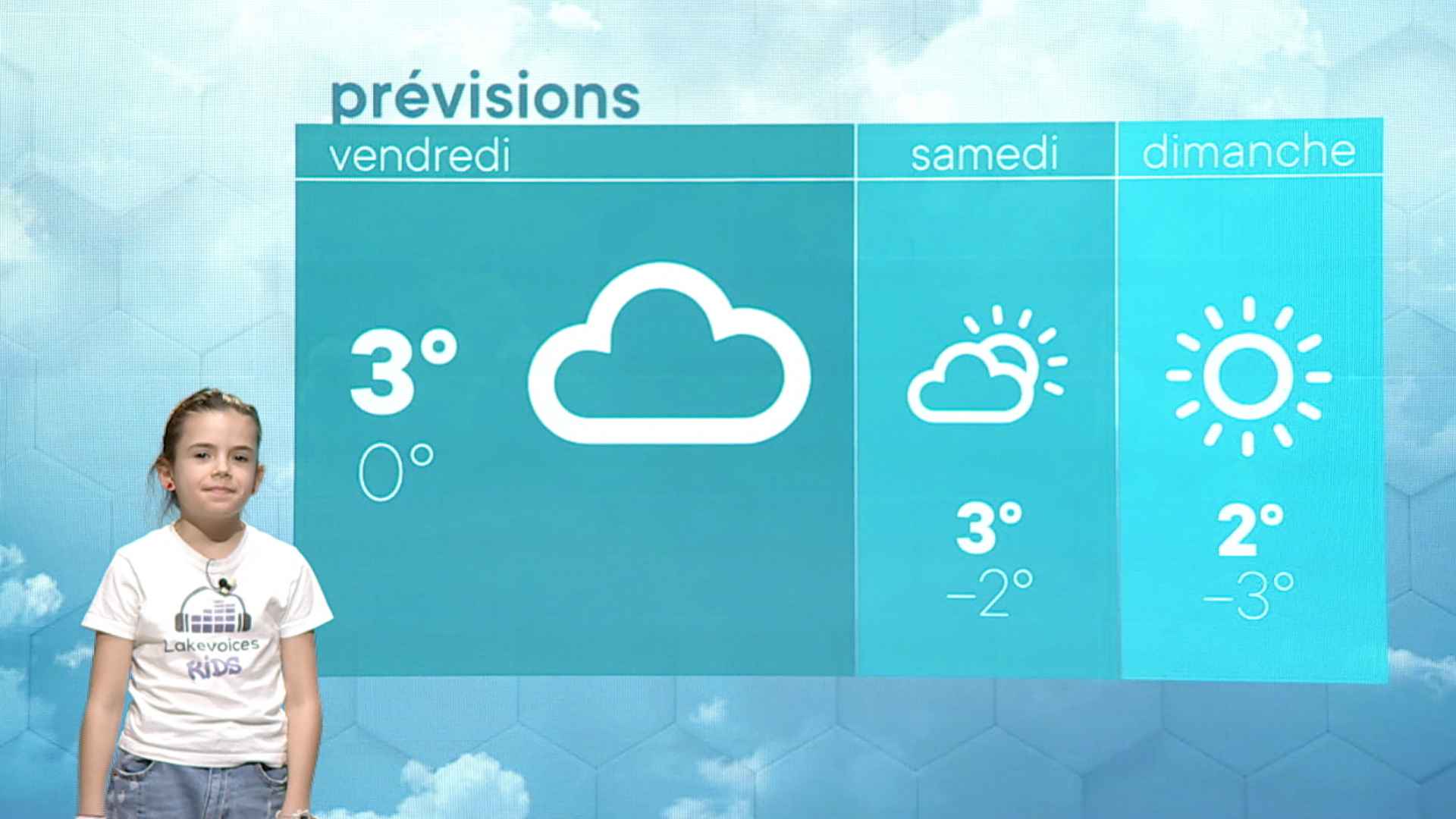 Le mercredi c'est le jour des enfants et le moment pour eux de faire leurs premiers pas devant une caméra de télévision. Ce mercredi, la Météo des Enfants vous est présentée par Marie. La Météo des Enfants, c'est pour tous les enfants âgés de 8 à 13 ans. en provenance du Jura, Canton de Neuchâtel, Jura-Bernois ou le Nord-Vaudois. Inscription par mail à : meteo@canalalpha.ch
