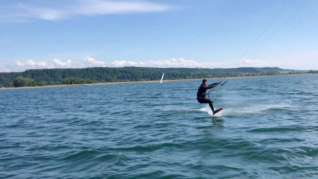 Du kitesurf comme vous ne l'avez sans doute jamais vu! Denis Rothenbühler s'envole à plus de 20m de l'eau, il avait d'ailleurs battu le record de Suisse en début d'année avec un saut à 21.3 mètres de haut. Vous allez le voir à l'oeuvre au Portugal, sur le lac des Quatre-Cantons, sur le lac de Neuchâtel (il saute par-dessus une digue) et même au sommet du Chasseral...