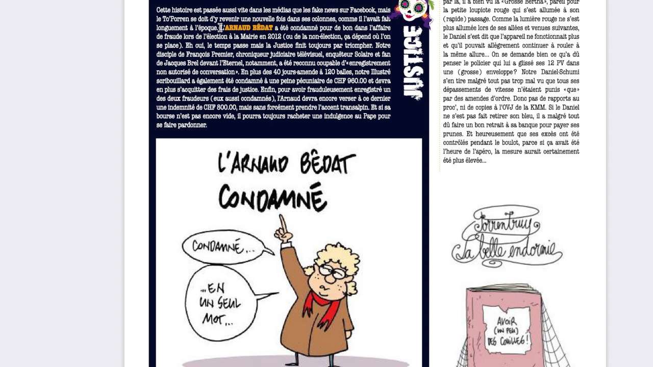 A l’approche des festivités de carnaval dans le Jura, le journal le "To’Porren" s’est retrouvé ce mardi devant le Tribunal de première instance à Porrentruy. Deux prévenus, dont le dessinateur Pitch Comment comparaissaient pour diffamation à l’encontre du journaliste bruntrutain Arnaud Bédat. La phrase écrite dans le "To'Porren" de 2019, "l’Arnaud Bédat a été condamné pour de bon dans l’affaire de fraude lors de l’élection à la Mairie de Porrentruy en 2012" a mis le feu aux poudres. L'auteur de l'article a été condamné pour diffamation, le dessinateur acquitté.
