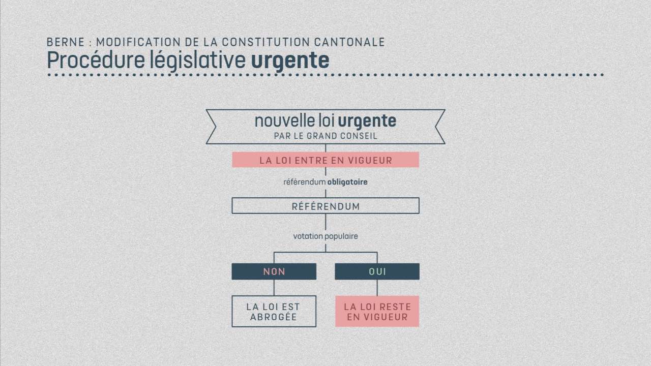 "Le 3 mars, en plus des votations fédérales, les Bernois devront se prononcer sur une modification de leur constitution. Actuellement, au sein des autorités cantonales, seule une procédure ordinaire existe pour la création et la modification des lois. Cependant, si le peuple bernois vote en faveur de cette modification constitutionnelle, le Conseil exécutif disposera d'un nouvel outil : une procédure législative urgente. Celle-ci permettra l'entrée en vigueur immédiate d'une loi (à l'image des lois Covid). Validée à l'unanimité par le Grand Conseil, cette solution serait unique en son genre dans l'Arc jurassien.