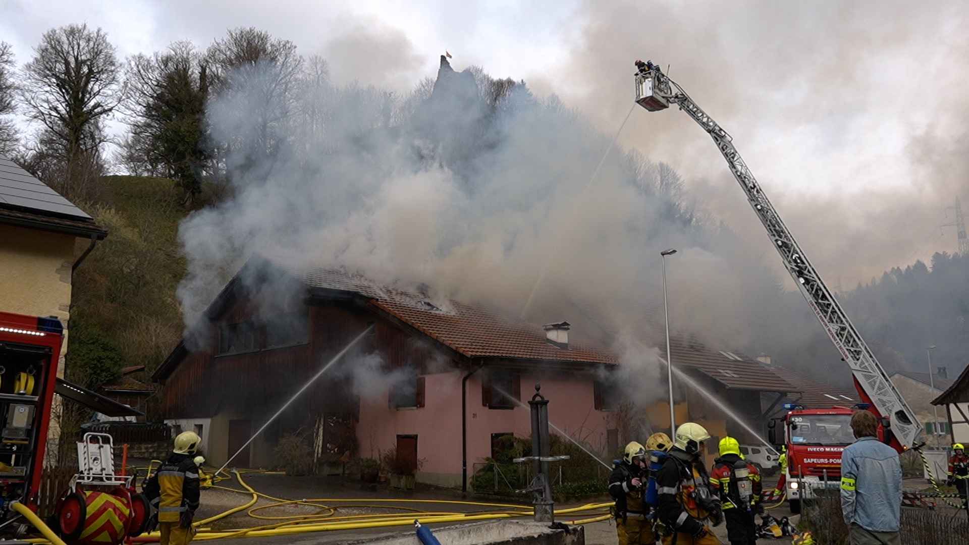 Un important dispositif de secours a été mobilisé mardi matin à Asuel après l’incendie d’une maison située à la rue Sous-le-Château. L’alerte a été donnée peu avant 10 heures. Au total, plus de trente pompiers des corps de Porrentruy, La Baroche et Mont-Terri sont intervenus avec une dizaine de véhicules pour maîtriser le sinistre. Grâce à leur intervention rapide, les dégâts ont pu être limités et aucune personne n’a été blessée, même si certains intervenants ont été contrôlés pour une possible inhalation de fumée. La route a été fermée durant l’opération et une déviation temporaire a été mise en place pour les transports publics. Une enquête devra déterminer l’origine du feu.