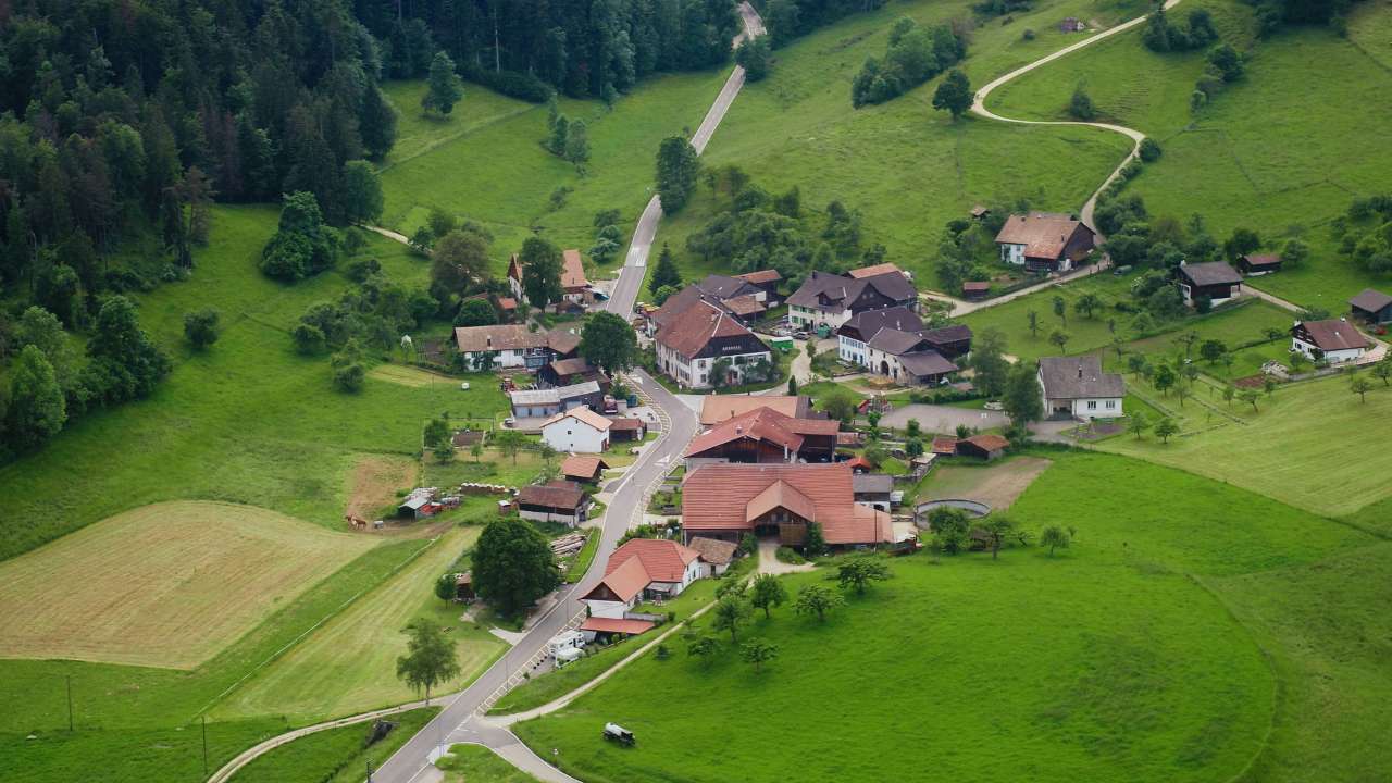 Bienvenue au-dessus de Châtelat, un village qui se trouve dans le Jura bernois et qui autrefois s’appelait Schellestellat. Installez-vous et découvrons ensemble ces petites ruelles vues du ciel.