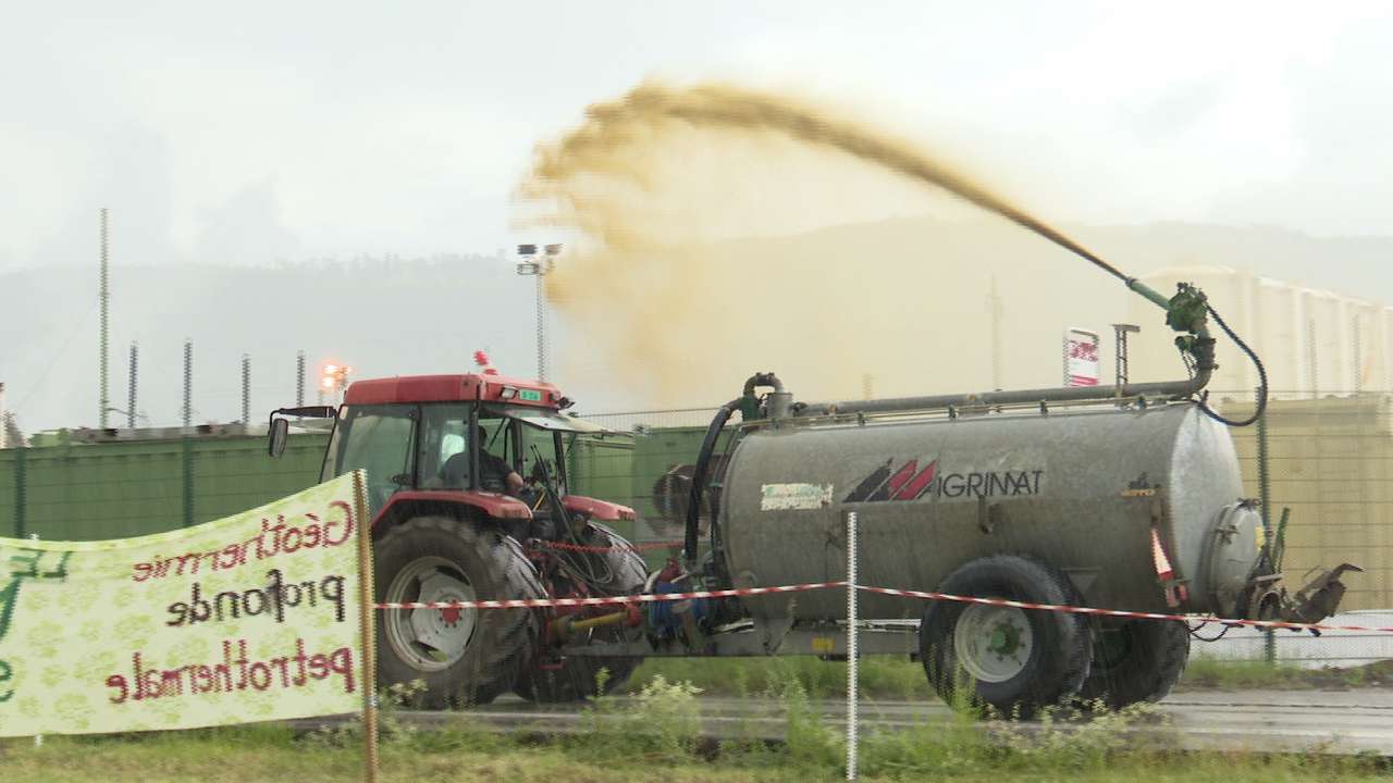 Les opposants se sont fait entendre, ce matin, à Glovelier. Ils étaient une centaine à manifester contre le début des travaux de forage sur le site de géothermie profonde. Un homme est entré sur le site et a déployé une banderole et un autre y a déversé du purin.