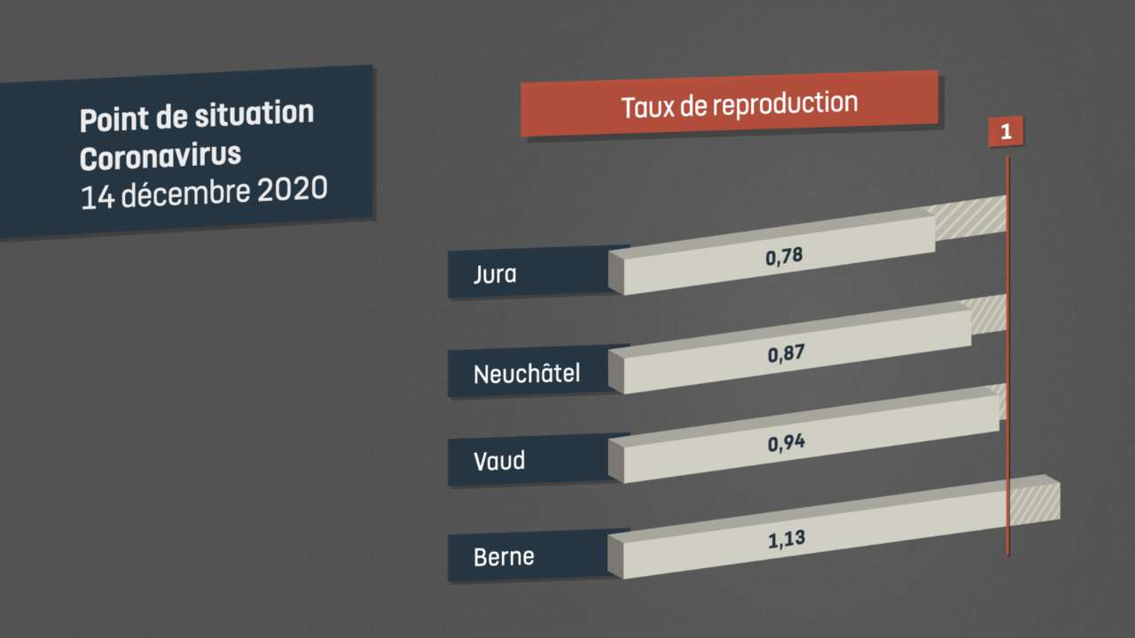 Sur le front du coronavirus, les dernières statistiques sont assez contrastées au plan régional ou national. Un mois après le pic, le RHNE soigne 81 malades, dont 6 aux soins intensifs, soit deux fois moins. Dans le Jura, il reste 12 hospitalisés, dont 1 au soins intensifs. Mais c’est surtout le taux de reproduction du virus que l’on regarde, puisqu’il conditionne la fermeture des établissements publics. Le Jura s’en sort le mieux, sur les 14 derniers jours, avec un taux de 0,78, en baisse, tout comme à Neuchâtel avec 0,87 et 0,94 pour les Vaudois. Il dépasse la limite dans le canton de Berne, avec 1,13.