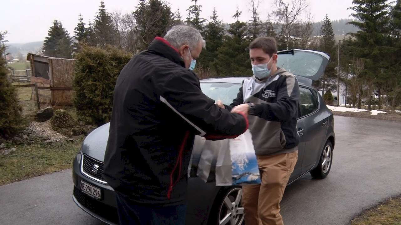 Si habituellement la Fête du froid de La Brévine est synonyme de convivialité, cette année elle rime plutôt avec livraison. La manifestation n'a pas pu avoir lieu comme prévu, mais les organisateurs ne se sont pas laissés abattre. Pour cette "9e édition bis", ils proposaient de se faire livrer la fameuse fondue "Chaux-des-Taillères", accompagnée de vin neuchâtelois et de meringues. Ce menu a séduit un nombre record de clients, avec 1'700 commandes. On a suivi une tournée avec le Unihockey Club de La Brévine, en livraison un peu partout dans le canton de Neuchâtel ce week-end.