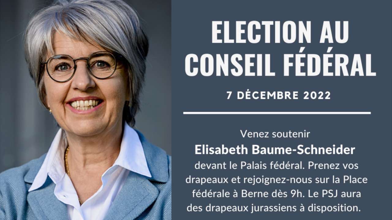 La place fédérale pourrait être remplie de drapeaux rouges et blancs mercredi prochain. Le Parti socialiste jurassien appelle toute la population jurassienne, et pas seulement ses partisans et sympathisants, à se rendre à Berne en train pour soutenir Elisabeth Baume-Schneider lors de l'élection au Conseil fédéral.