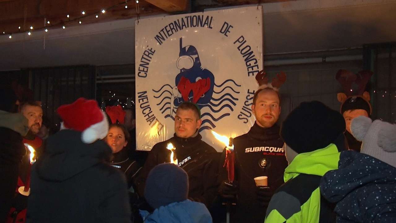 Samedi soir, à Neuchâtel, le Père Noël a fait une arrivée particulièrement remarquée devant une cinquantaine de personnes. Il est sorti directement du lac, traîné par 14 rennes un peu spéciaux. Les plongeurs du Club international de plongée se sont prêtés au jeu. Les enfants ont ensuite eu droit à la traditionnelle distribution de cadeaux.