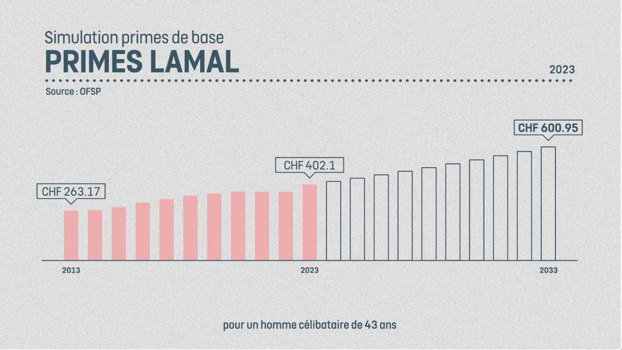 Dans le canton de Neuchâtel. A l'exception de 2021 et 2022 où les primes LAMal ont baissé de quelques centimes, toutes les autres années ont été une succession de hausses, en moyenne plus de 4% de plus par an. À ce rythme, dans dix ans, un homme célibataire de 43 ans, pourrait payer CHF 600 de prime d'assurance maladie par mois alors qu'elle coûte CHF 400 aujourd'hui.
