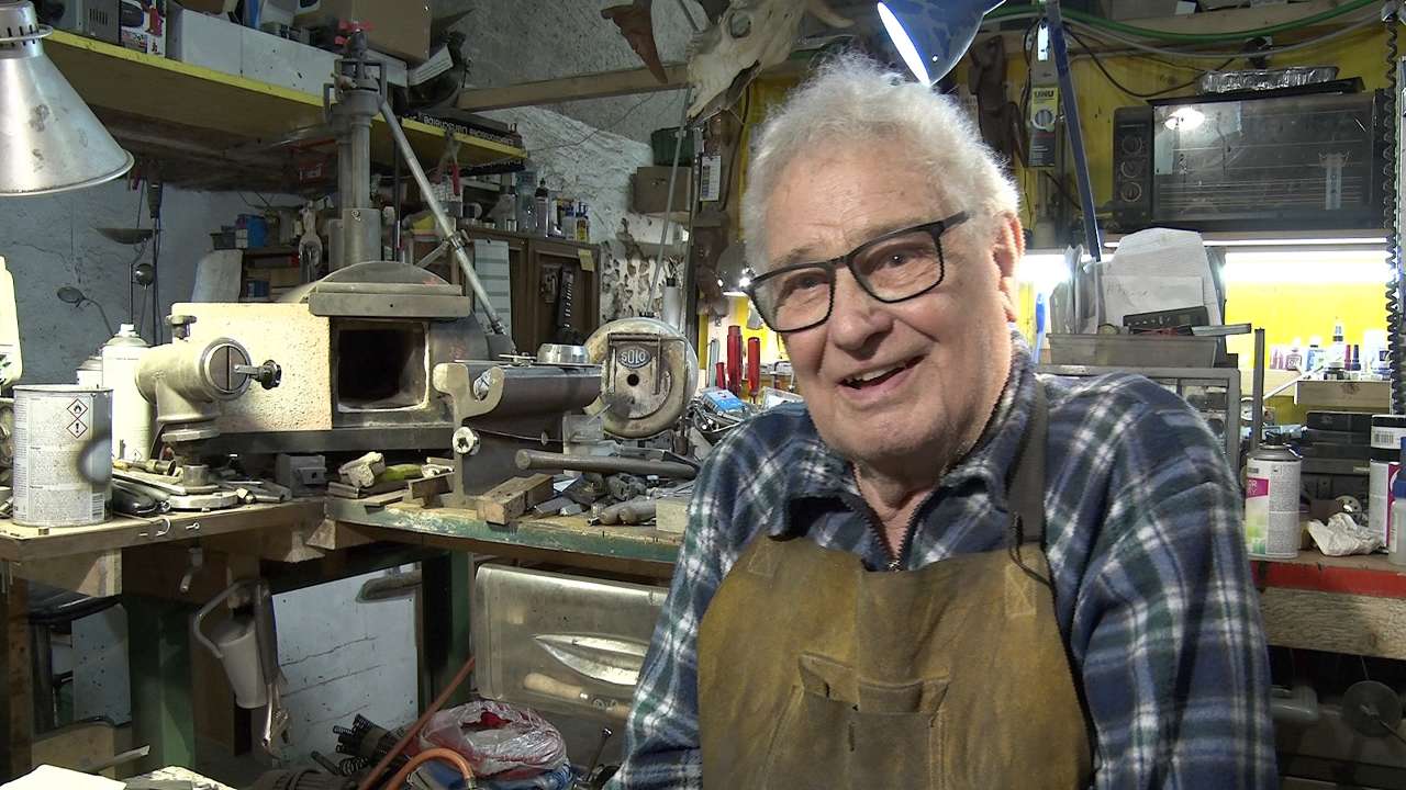 Emo De-Marco a quitté l'Italie pour la Suisse le 19 février 1957, alors à peine âgé de 22 ans. Après une longue carrière comme électricien dans le canton de Neuchâtel, cet artisan passionné, aujourd'hui âgé de 88 ans, coule une retraite paisible et méritée à Saint-Aubin, où il passe la plupart de ses journées à fabriquer des couteaux personnalisés, entièrement réalisés à la main, du croquis de départ, jusqu'au montage final. Pour le trouver, promenez-vous à l'intersection de la Rue des Centenaires et du Chemin de Bayard ; si vous voyez un bus noir parqué devant l'atelier, c'est qu'Emo est là, en train de bricoler.