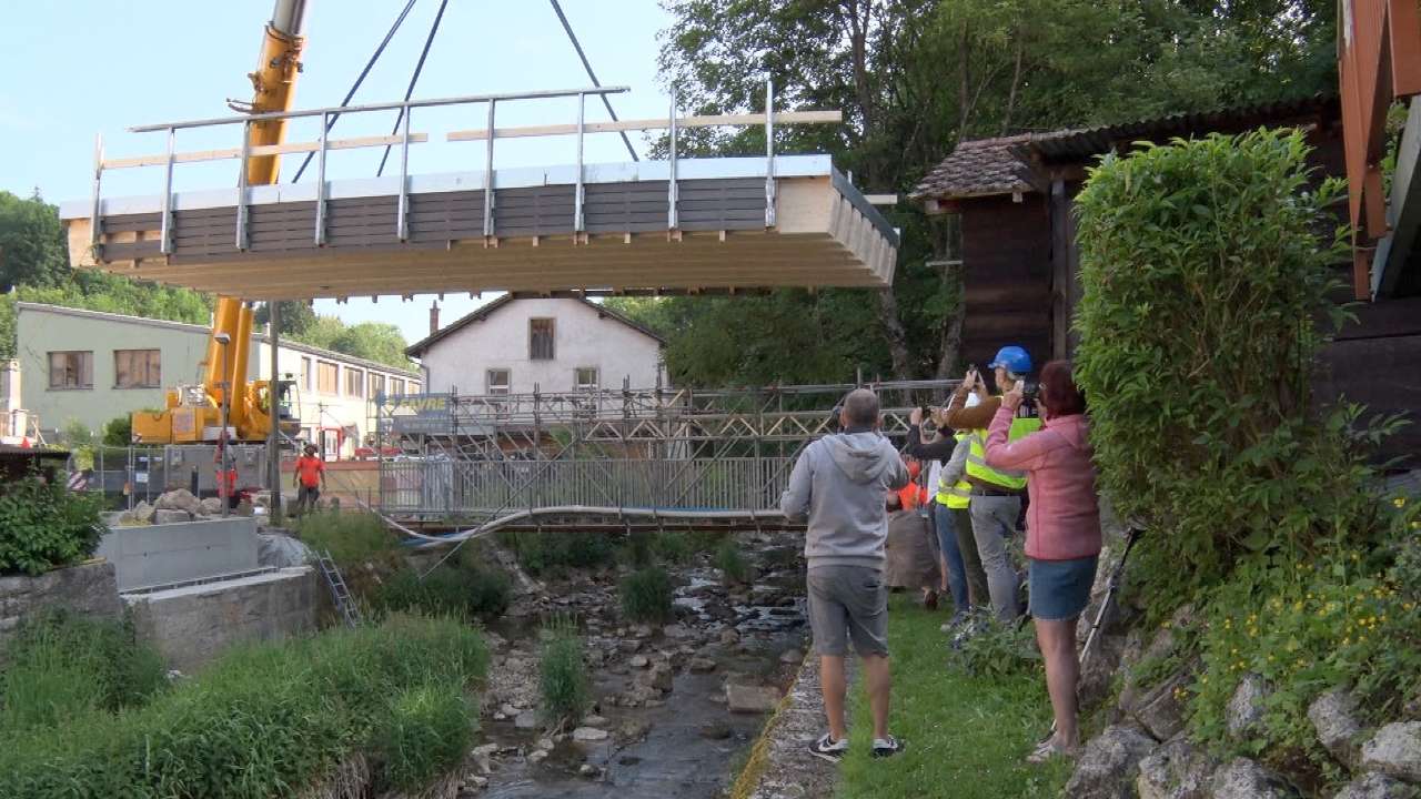Le nouveau petit pont en bois, qui enjambe le Seyon, a été posé ce matin à Valangin. Les travaux avaient débuté mi-février pour remplacer l'ancien petit pont en acier dit "Le Tirage" datant de 1913. Le remplacement s'inscrit dans une démarche durable, le bois provient des forêts de la ville de Neuchâtel. Le pont sera praticable à partir de cet été.