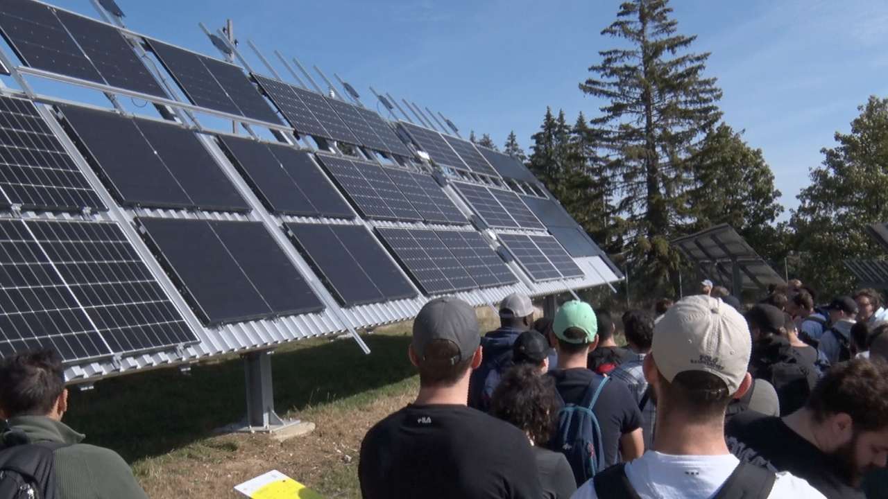 C'est une première pour la Haute École Arc Ingénierie. Ses étudiants de première année sont sensibilisés aux enjeux liés au climat et à l'énergie du 9 au 12 octobre. Une semaine complète avec des ateliers, des conférences et des visites où les futurs ingénieurs explorent les thèmes de la sobriété énergétique et des énergies renouvelables. Les questions de durabilité font désormais partie de leur cursus pour répondre aux défis climatiques et énergétiques de demain. Pour conclure cette semaine thématique, les étudiants visitaient la centrale éolienne et solaire de Mont-Soleil, ce jeudi.