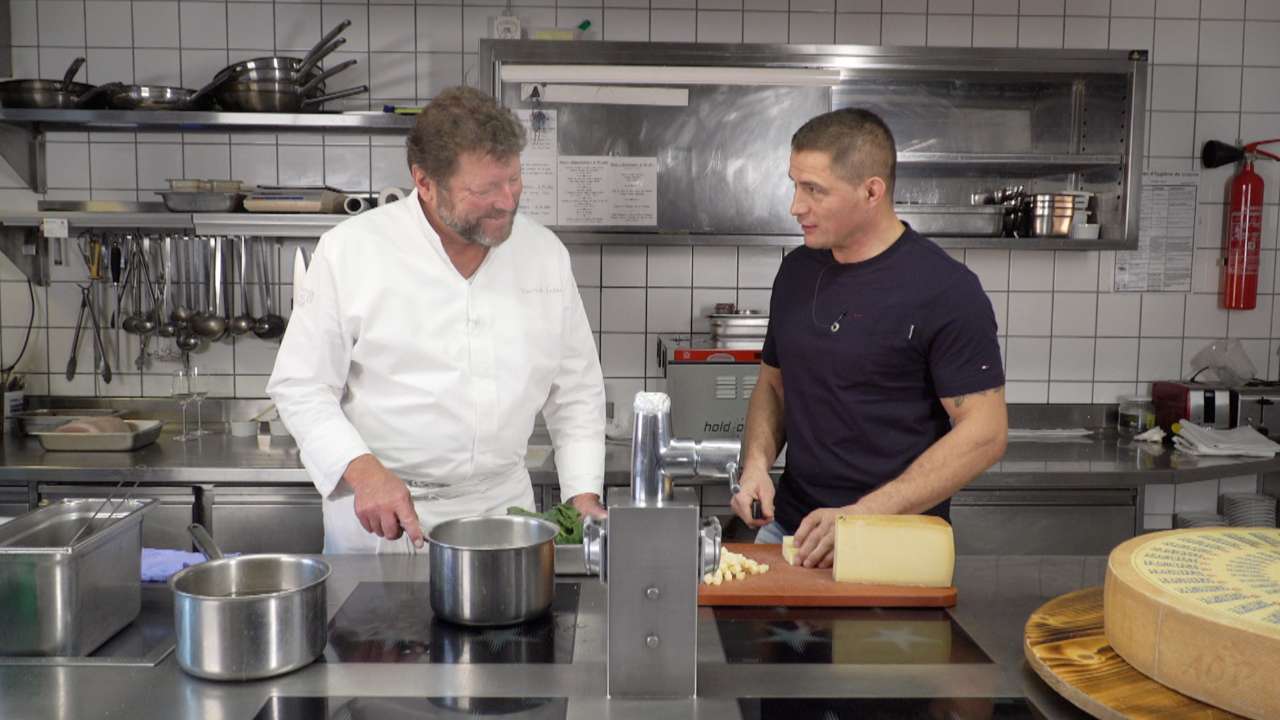 Des chefs de grandes tables et des maîtres fromagers se rencontrent et réalisent ensemble des plats gastronomiques. Ces différentes assiettes, ces propositions inédites, mettent en valeur un produit suisse, un fromage de notre terroir. Dans les recettes de cette émission, le Gruyère est roi et il pourrait vous surprendre. Aujourd'hui, Pierrick Suter, chef au Restaurant de la Gare à Lucens, et Benoît Kolly, fromager à Ferpicloz, préparent des crépinettes aux épinards, jambon et Gruyère AOP.