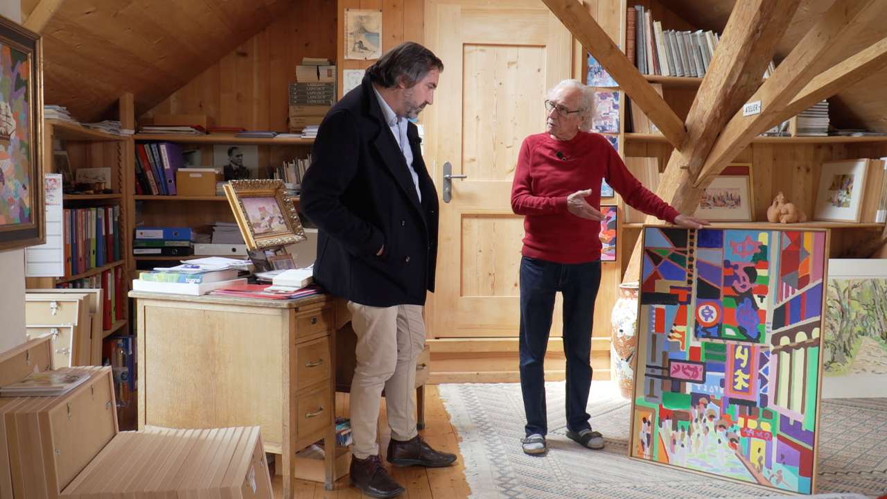 Nous sommes à l'orée de la forêt à Villiers. C'est là que vit Aloys Perregaux et son épouse Lise. Sa maison est un lieu de vie mais aussi un atelier pour le peintre. C'est ici qu'il met en couleurs le monde, son monde. Julien Spacio est un vieil ami d'Aloys, «Les Visiteurs» c'est une occasion de se retrouver et de voyager un peu dans l'univers de l'artiste.