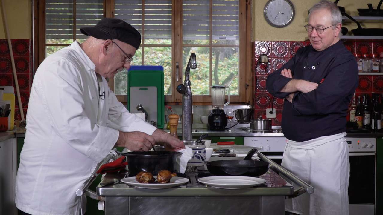 Nous sommes au Restaurant Le Grillon aux Prés-d'Orvin. Daniel Jeandrevin reçoit Michel Stangl, chef à l'Hôtel de Commune à Dombresson. Nos deux chefs vont réaliser ensemble un poulet, provenant du domaine de Lordel, aux bolets des bois et tomates confites.