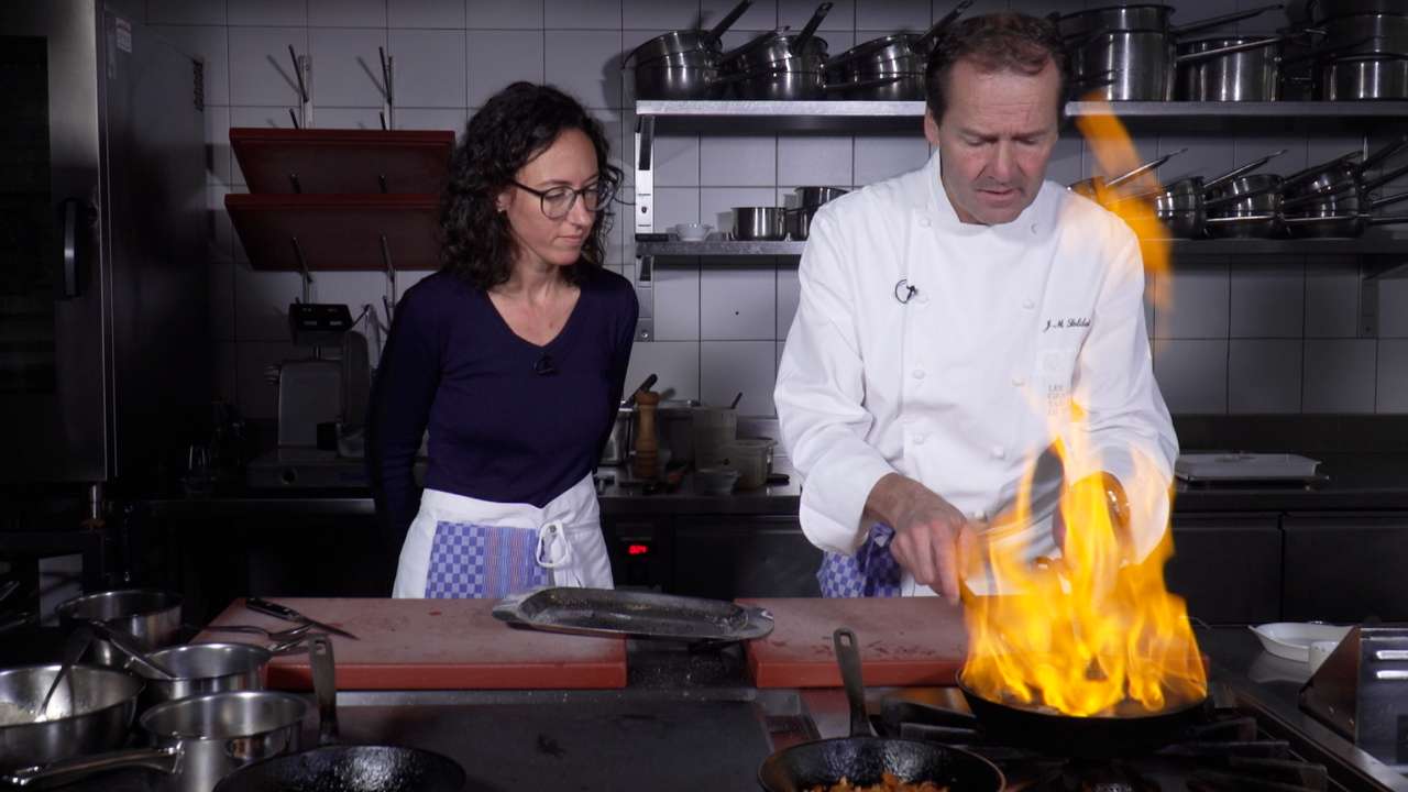 Nous sommes à l'Hôtel-Restaurant du Cerf, à Sonceboz. Jean-Marc Soldati reçoit Annie Rossi, oenologue et régisseur au Domaine de la Grillette. Ils vont réaliser ensemble une mignonette de chevreuil au genièvre.